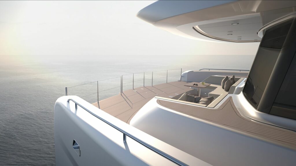 Cömert kıç güvertesine ek olarak, yat, gün batımı gezileri için ideal olan gömme salon alanına sahip öne bakan bir güverte sunar. Güneşlenme güvertesinde özel güneşlenme alanı ve üstü kapalı flybridge bulunmakta.